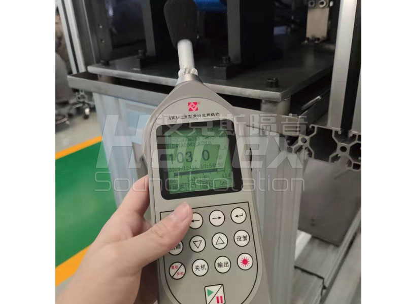 設(shè)備整體加裝漢克斯隔音罩方案進(jìn)行降噪。隔音罩的吸隔聲板采用100mm厚的復(fù)合鋼板,由外至內(nèi)分別為:外層采用厚1.5mm鍍鋅鋼板或者1.5mm不銹鋼板,不銹鋼有更號(hào)的防腐蝕型,接觸水的設(shè)備推薦采用不銹鋼材質(zhì),(模塊板外表面噴塑,中間填充48kg/m3離心玻璃棉,吸音棉用高密度吸聲玻璃絲布包裹,內(nèi)表面采用厚0.8mm鍍鋅孔板或鋁穿孔板,孔板穿孔率為大于25%,內(nèi)龍骨采用1.5mm鍍鋅鋼板或1.5mm不銹鋼折成。1.5mm加強(qiáng)筋、隔聲層、吸聲層組成。隔聲罩設(shè)計(jì)隔聲量≥20dB(A)。