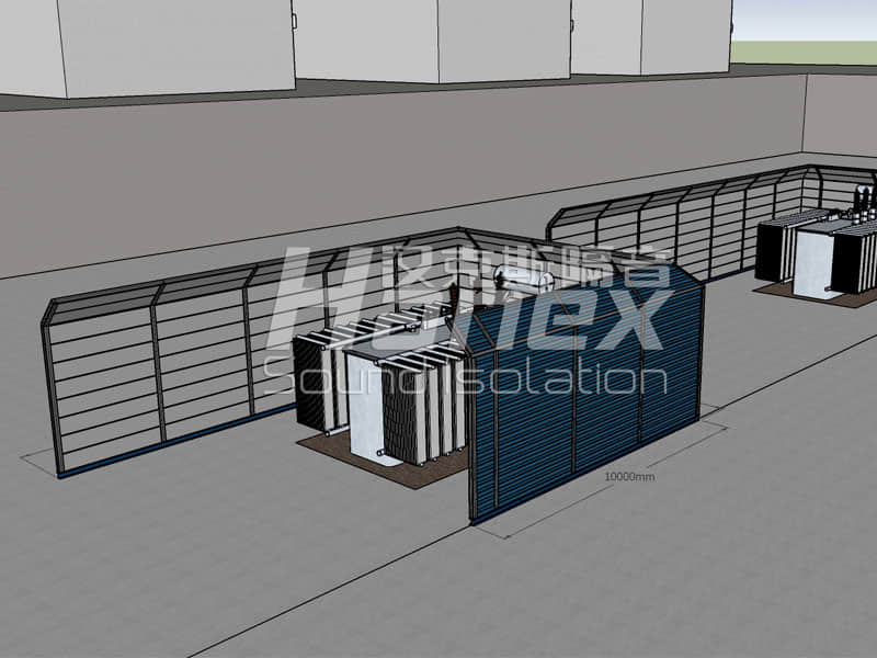 根據(jù)現(xiàn)場噪聲源值大小、頻譜、噪聲源與附近居民樓位置關(guān)系、設(shè)備通風(fēng)散熱要求等因素,結(jié)合我們漢克斯隔音以往同類型項目分析,設(shè)計對該變電站采用2道U型屏障的方式進(jìn)行降噪處理。